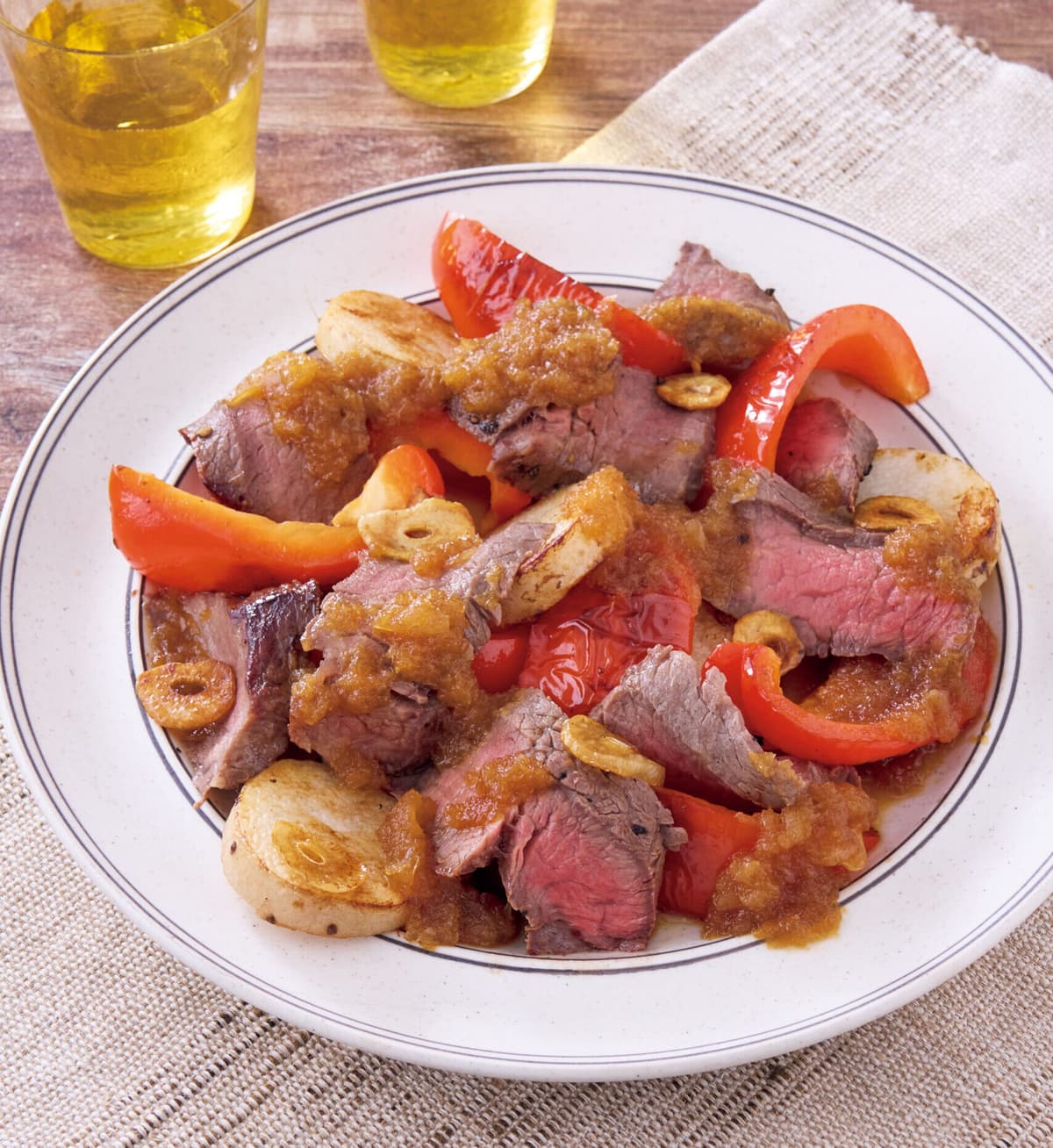 パプリカは縦半分に切ってへたと種を取り、それぞれ放射状に縦4等分に切る。長いもはよく洗い、皮つきのまま幅1cmの輪切りにする。にんにくは薄い輪切りにし、しんを取る。牛肉に塩、粗びき黒こしょうをふる。玉ねぎはすりおろす。ボールにAを入れて混ぜ、さらに玉ねぎを加えて混ぜ、ソースを作る。