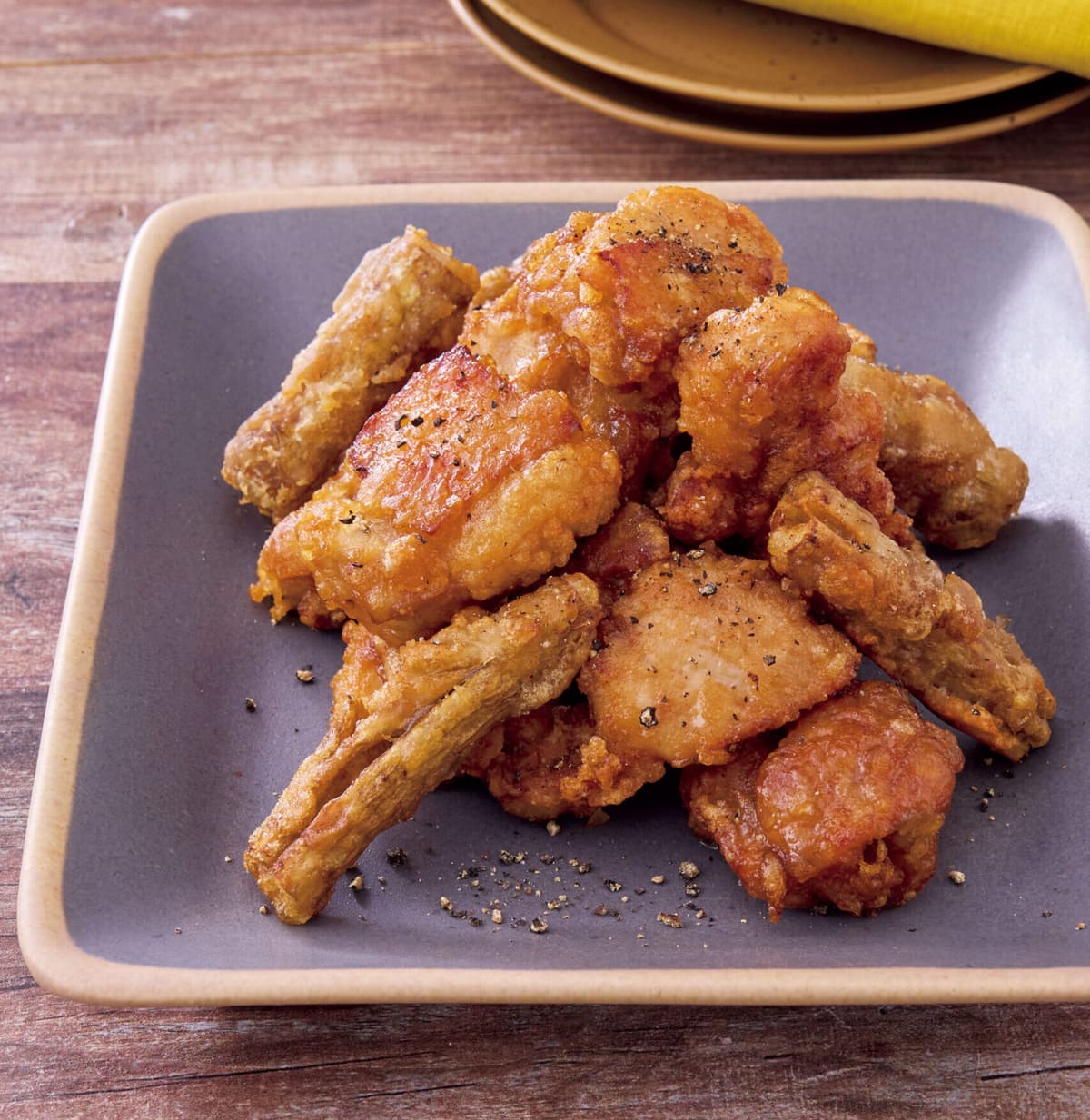 フライパンにサラダ油を高さ5mmくらいまで入れ、中温(※)に熱する。鶏肉を入れ、1分ほど揚げて返し、あいているところにごぼうを加える。ときどき返しながらさらに4分ほど揚げ、油をきって器に盛り、粗びき黒こしょう少々をふる。