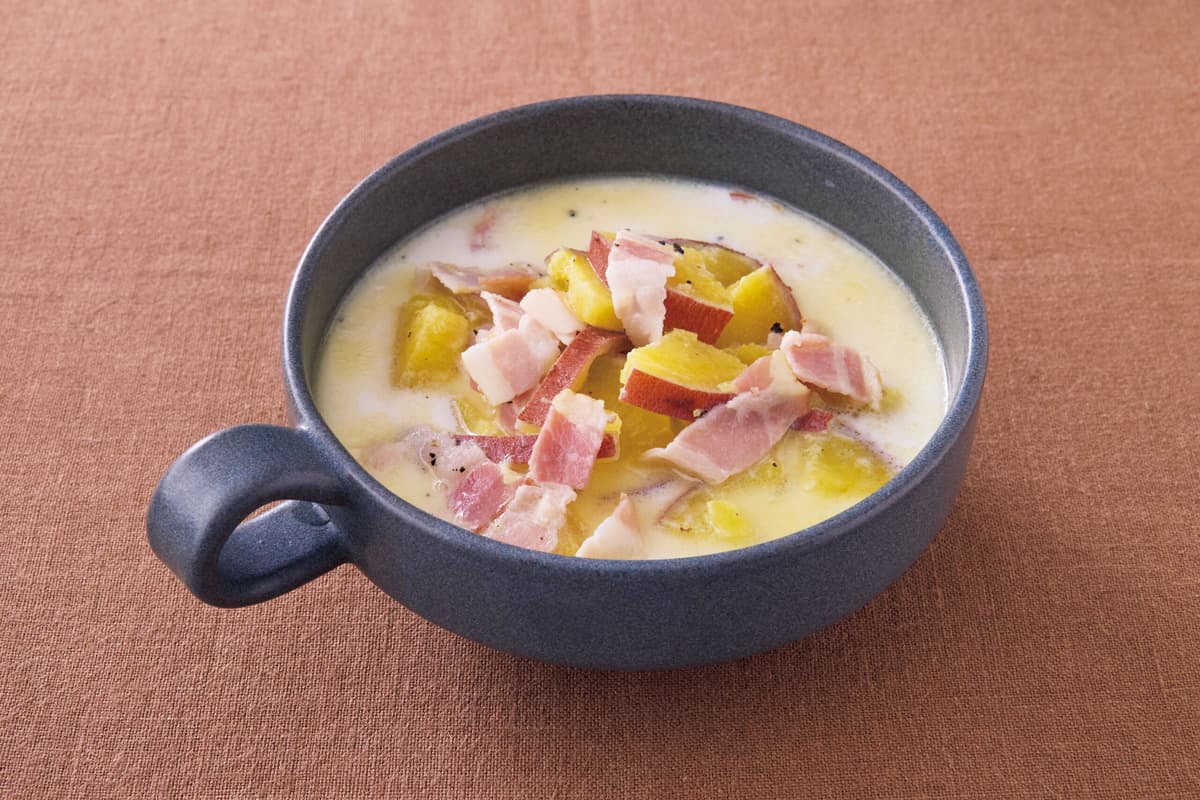 鍋にバターを中火で熱してベーコンをさっと炒め、さつまいも、水1/2カップを加えてふたをし、煮立ったら5分ほど煮る。牛乳、塩、粗びき黒こしょうを加え、さつまいもをかるくくずしながらひと煮立ちさせる。