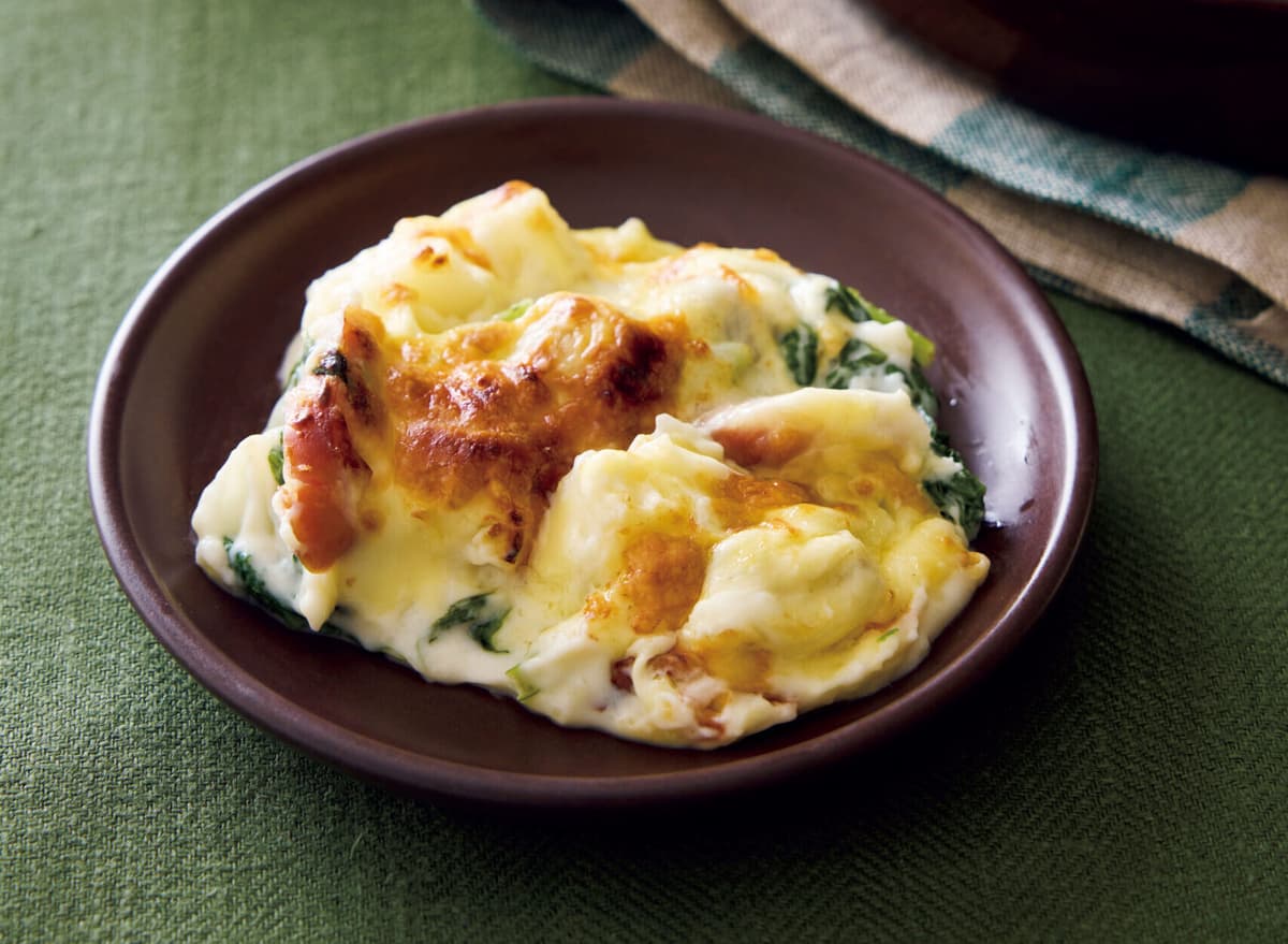 耐熱の器に【2】を広げ入れ、ピザ用チーズを散らす。オーブントースターで、チーズが溶けて焼き色がつくまで5分ほど焼く