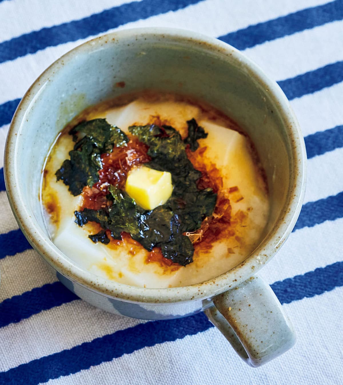 耐熱のマグカップに水大さじ4、もちを入れ、ラップをかけずに電子レンジ(600w)で1分20秒~1分30秒加熱し、余分な水を捨てる。