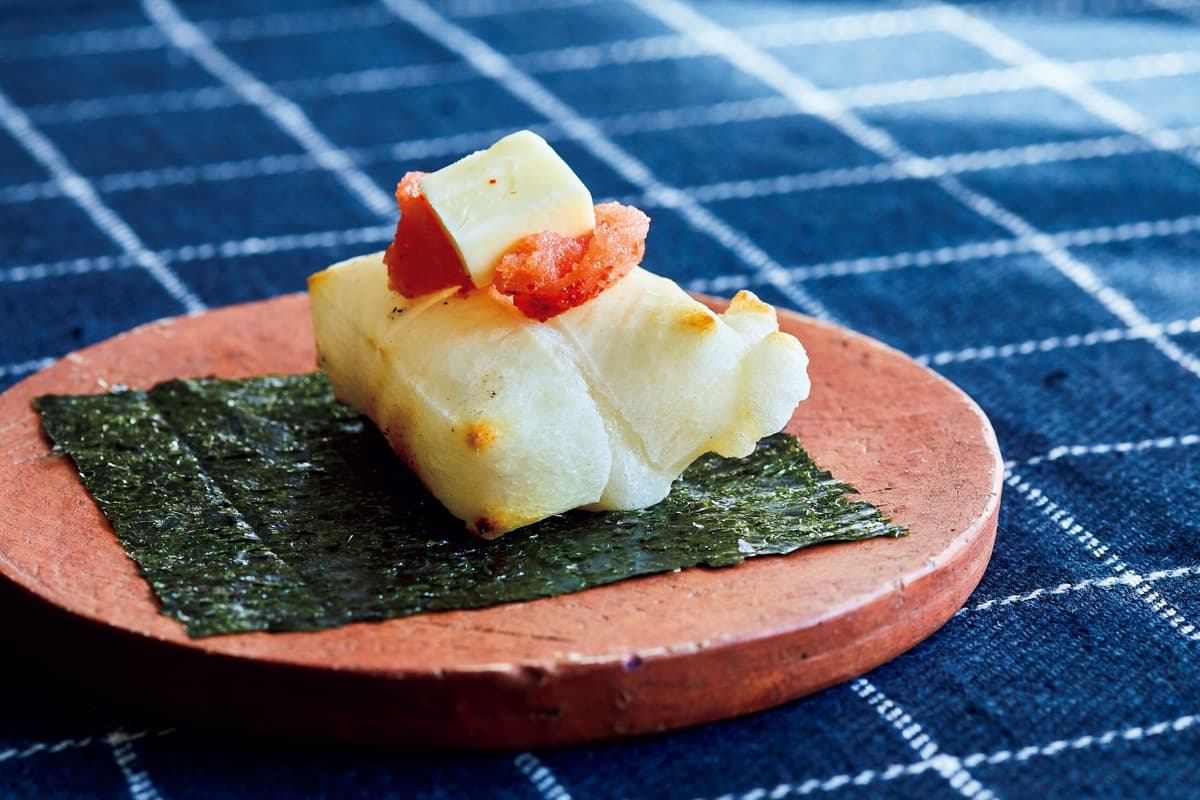 明太子は幅1cmに切り、のりは半分に切る。のりの上にもちを置き、明太子とバターを1/2量ずつのせ、しょうゆ少々をかける。