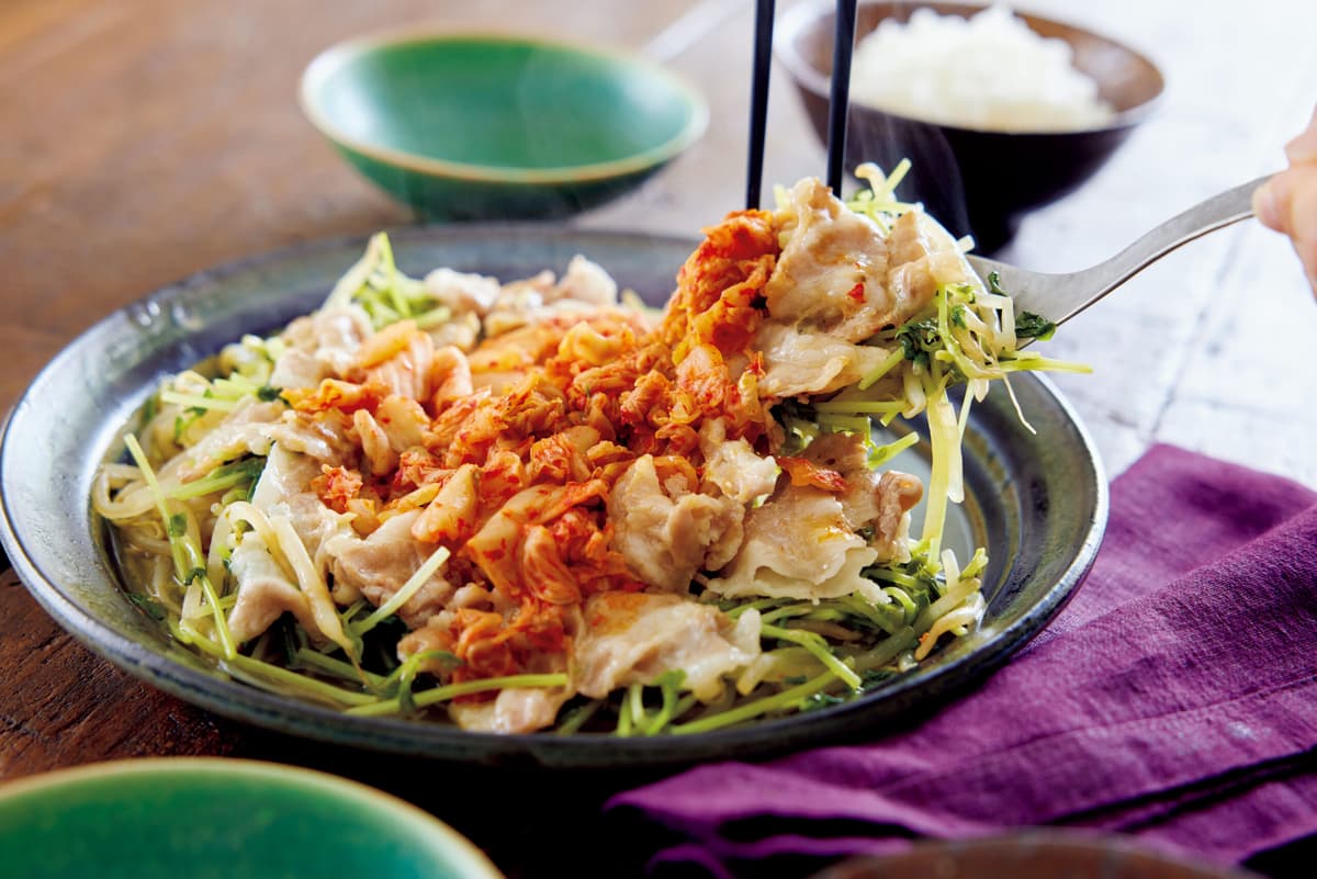 直径24cmのフライパンにもやし、豆苗、豚肉、キムチの順に広げ入れる。