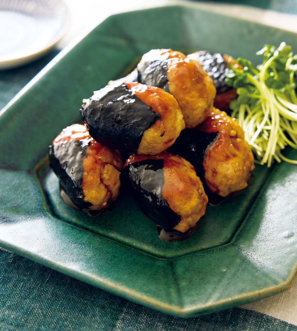 えのきは石づきを切ってから長さ1cmに切り、根元のほうはほぐす。貝割れは根元を切る。焼きのりは8等分に切る。ボールにひき肉、えのきを入れ、Aを加えて練り混ぜる。粘りが出たら8等分にしてたわら形にまとめ、焼きのりを巻く。Bは混ぜる。