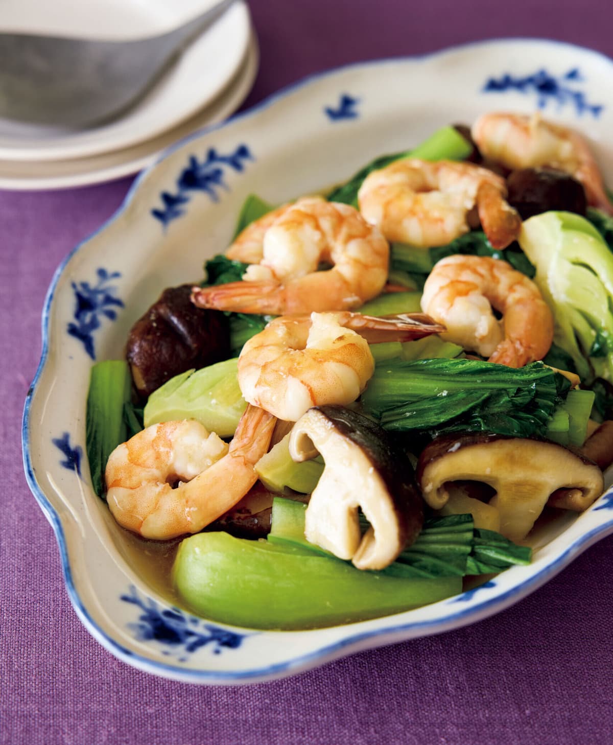 青梗菜は葉と茎に切り分け、葉は幅3cmに切り、茎は6つ割りにする。しいたけは石づきを切り、縦半分に切る。えびは尾の1節を残して殻をむき、背わたを取ってボールに入れる。塩少々、片栗粉を加えてもみ込み、さっと水で洗ってペーパータオルで水けを拭き取り、塩少々をふる。Aは混ぜる。