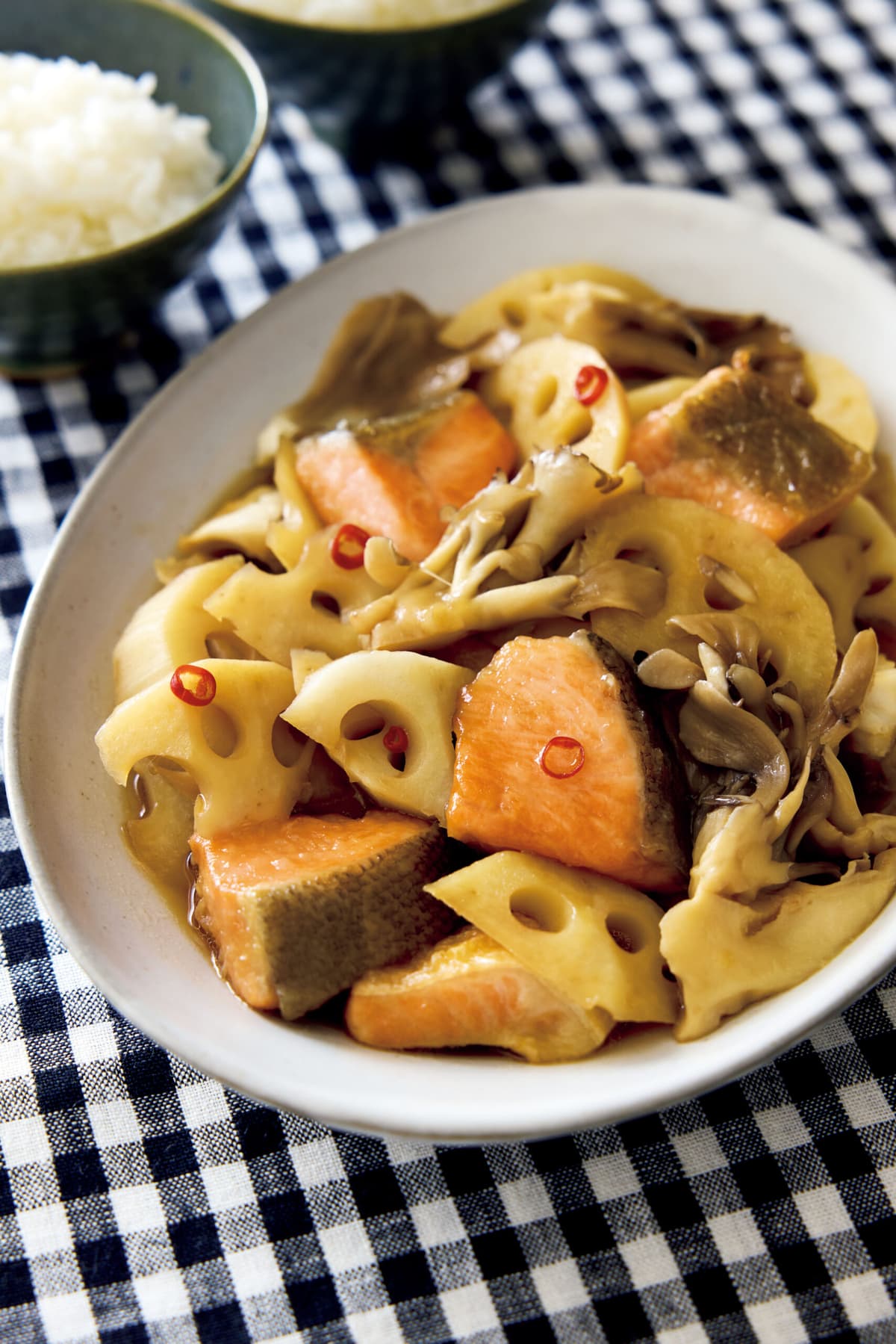 旬の秋鮭が主役の煮ものにはうまみのあるまいたけをプラスして季節感のあるひと皿に。