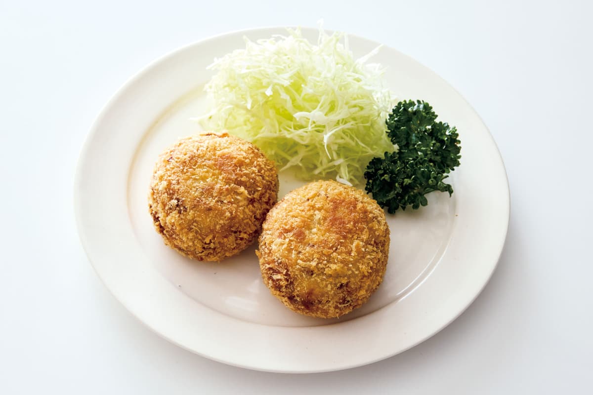 【4】を6等分し、平たい円形にまとめる。小麦粉をまぶし、溶き卵にくぐらせてパン粉を全体にまぶす。バットなどに並べて冷蔵庫に入れ、30分ほどおいてやすませる。