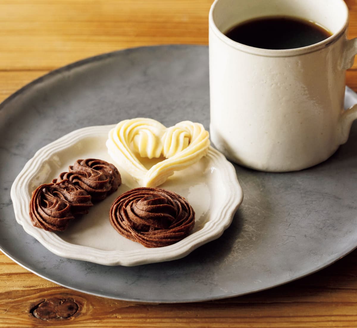 用意するのは板チョコと小麦粉だけ。焼くからこそ生まれるさくっとした食感と、口の中でほろっとくずれる瞬間はまさに至福。 絞り出し袋を使えば、バラやハート、いろんな形が作れます。カカオの風味が香るミルクと、濃厚な甘さのホワイト、どちらも楽しんで。 ●カロリー/ミルク1個43kcal ホワイト1個39kcal