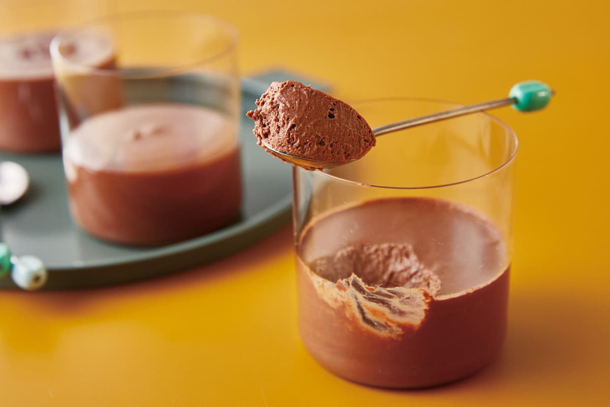 レンチンして泡立てるだけで、口当たりは軽く、味わいは濃厚なチョコスイーツのでき上がり。 至福のデザート時間をどうぞ。