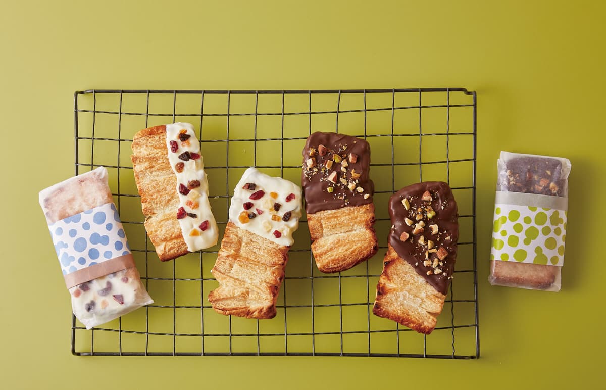チョコレート、ドライフルーツ、ナッツは粗く刻む。ブラックチョコを耐熱の器に入れ、ラップをかけずに電子レンジ(600w)で50秒~1分加熱し、ゴムべらで混ぜてなめらかに溶かす。【2】のパイ3個に溶かしたチョコを塗り、ドライフルーツやナッツを散らす。ホワイトチョコも同様にし、冷蔵庫で10分ほど冷やす。