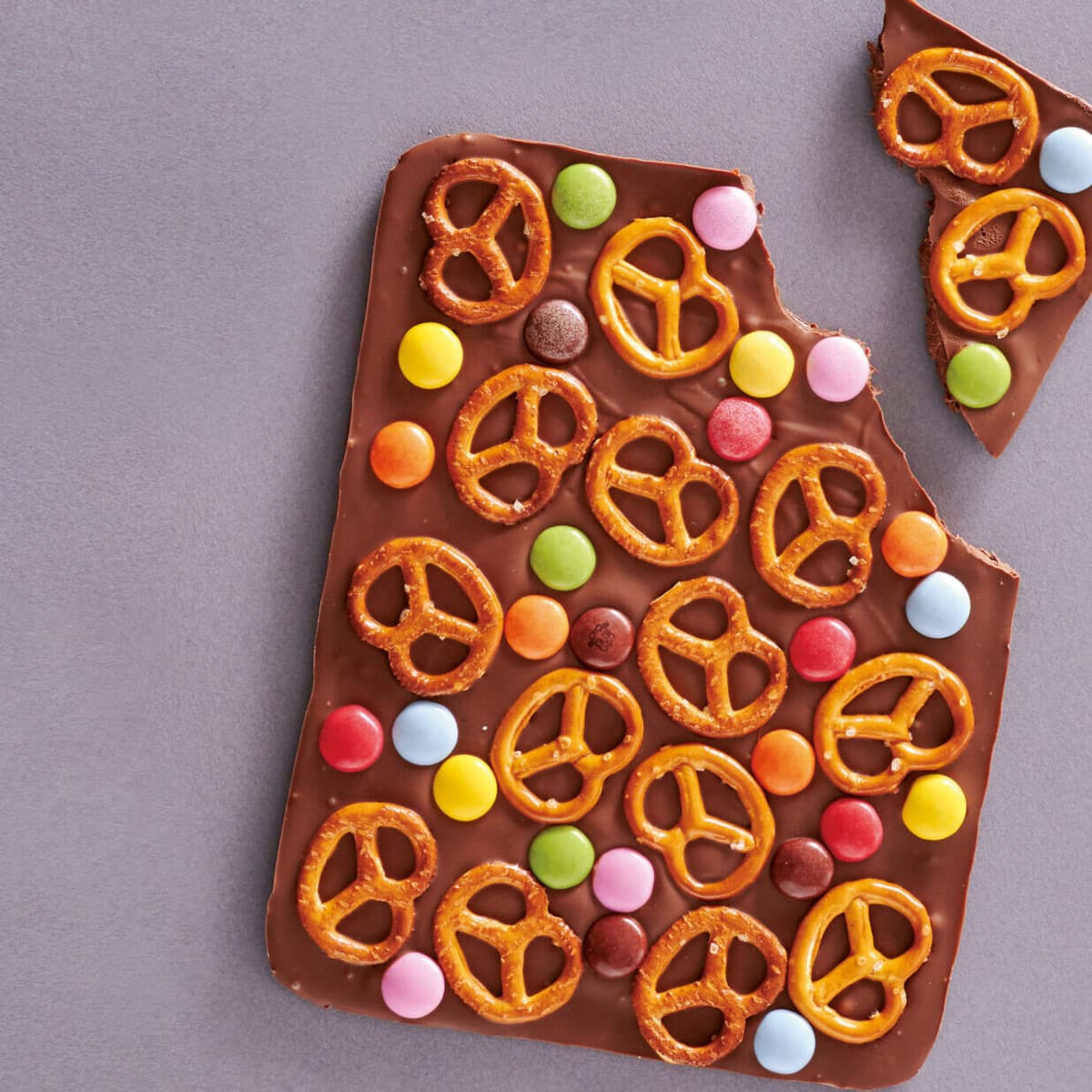 プレッツェルを全体にまんべんなくのせ、すきまを埋めるようにカラーチョコレートをのせる。冷蔵庫で30分ほど冷やし固め、オーブン用シートをはがして好みの大きさに割る。冷蔵庫でさらに30分以上冷やす。