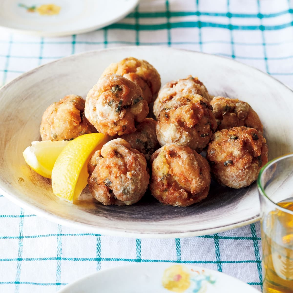 揚げ油を中温※に熱し、1を入れる。ころがしながら、こんがりとするまで5分ほど揚げる。器に盛り、レモンを添える。