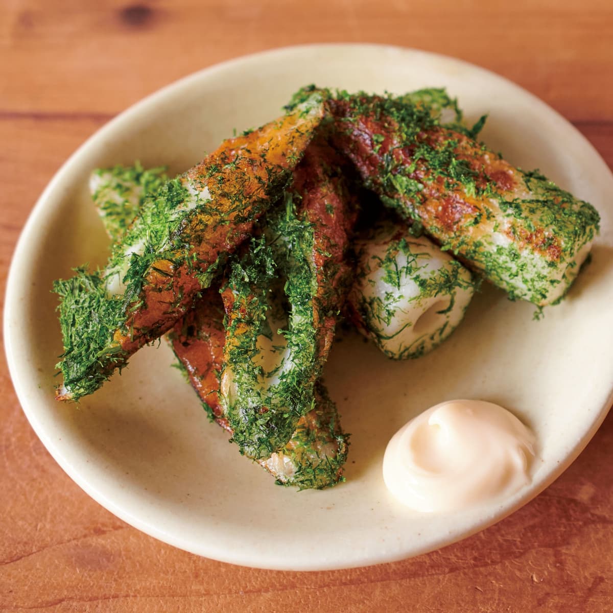 ちくわは斜めに4等分に切る。フライパンにごま油を中火で熱し、ちくわをこんがり焼き色がつくまで、ころがしながら焼く。バットに青のりを広げ、ちくわにまぶす。器に盛り、マヨネーズを添える。