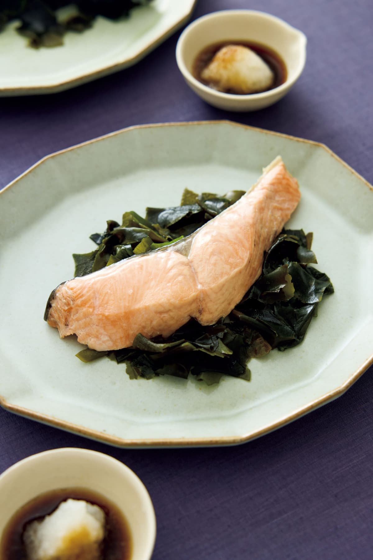 フライパンに【1】のわかめを広げ入れ、鮭をのせる。酒をふり、ふたをして中火で熱し、煮立ったら弱火にして5分ほど蒸す。鮭とわかめを器に盛り、小さめの器に大根おろしとポン酢しょうゆを入れて添え、つけて食べる。