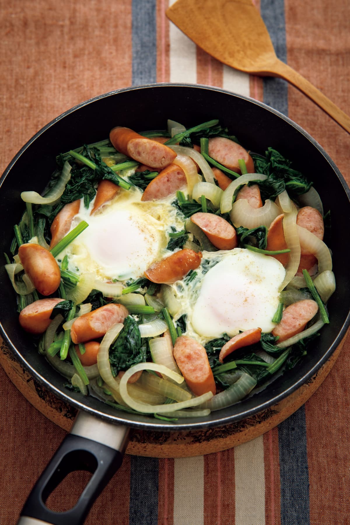 直径24cmのフライパンにサラダ油を中火で熱し、玉ねぎ、ソーセージを炒める。玉ねぎが透き通ってきたらほうれん草を加え、さらに炒める。ほうれん草がしんなりとしたら水1/2カップ、スープの素を加えて2分ほど煮て、塩、こしょうで味をととのえる。くぼみを2カ所作り、卵を1個ずつ落とし入れてふたをし、2分ほど蒸し煮にする。