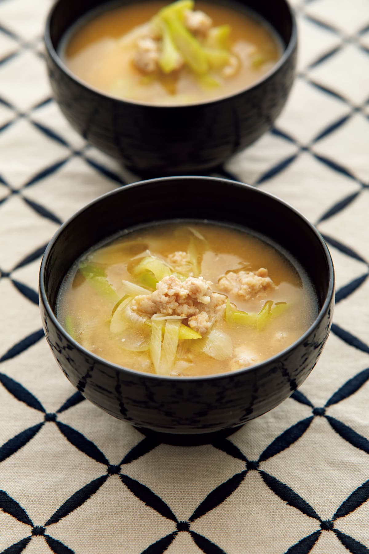 鍋にサラダ油を中火で熱し、ねぎとひき肉を入れる。ひき肉をほぐしながら炒め、肉の色が変わったら水2カップを加えて混ぜる。煮立ってきたらさらに2分ほど煮て、みそを溶き入れる。