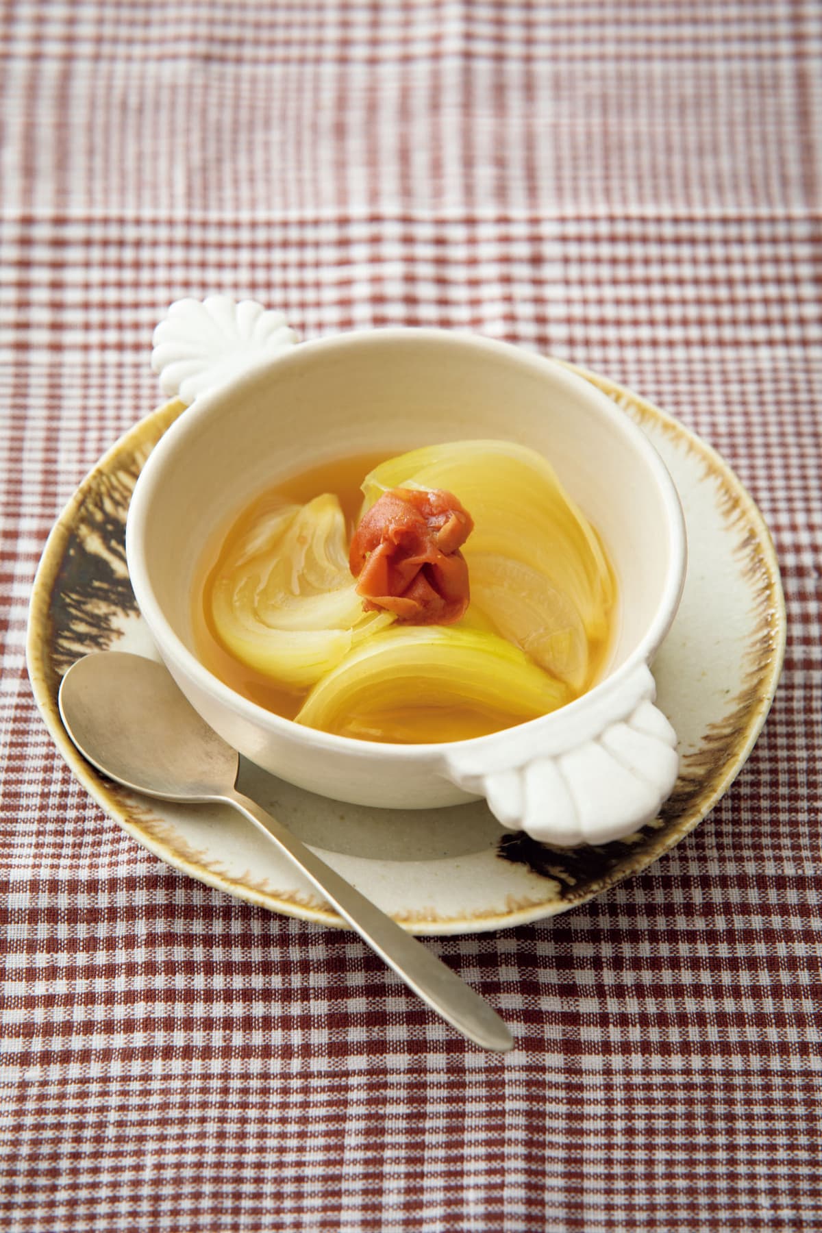 小鍋に玉ねぎと水1カップ、スープの素を入れて中火にかけ、12分ほど煮る。汁ごと器に盛り、【1】の梅肉をちぎってのせ、梅肉をくずして玉ねぎにからめながら食べる。