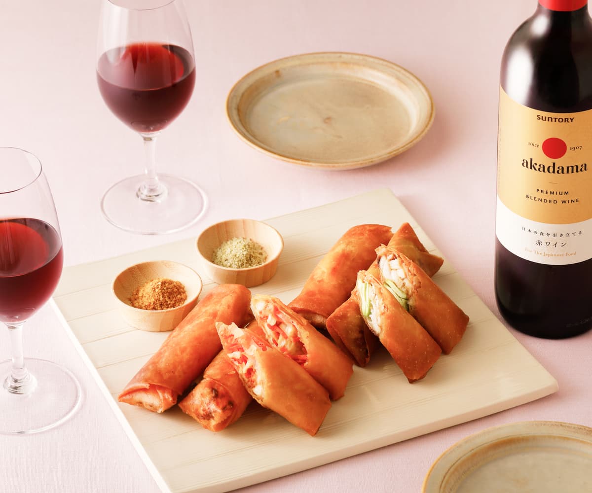 新にんじん、そら豆など、季節の野菜をメインにした春巻き2種をご紹介。鶏ささ身や鯛にしょうゆ、みそで下味をつけることで、野菜の自然な甘さと和風の味わいが重なり合います。ほんのりした甘みのある赤玉プレミアムと相性抜群の、春ならではのおいしさを堪能して。