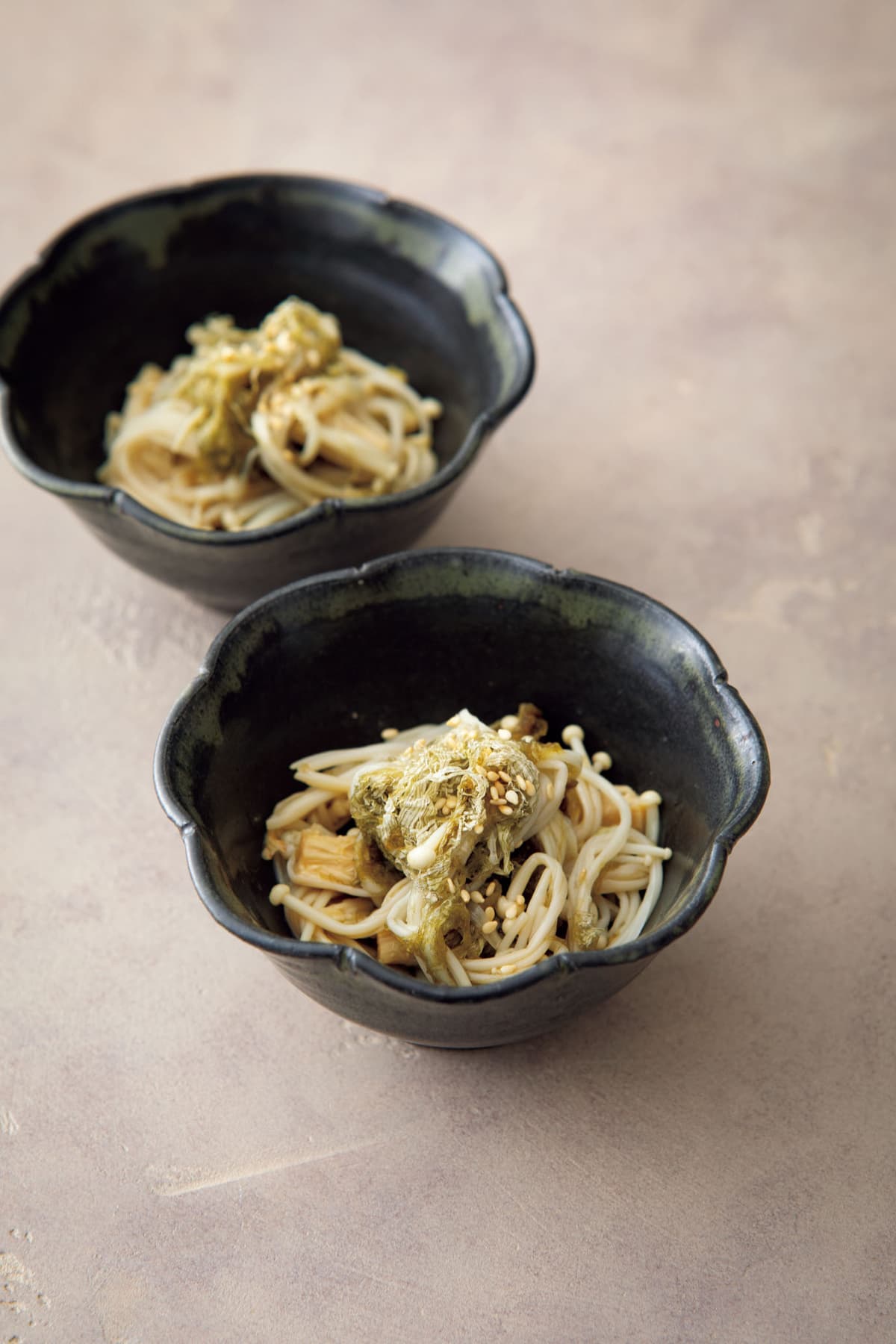 えのきだけは根元を切り、かるくほぐす。熱湯で1分ほどゆで、ざるに上げて水けをきる。