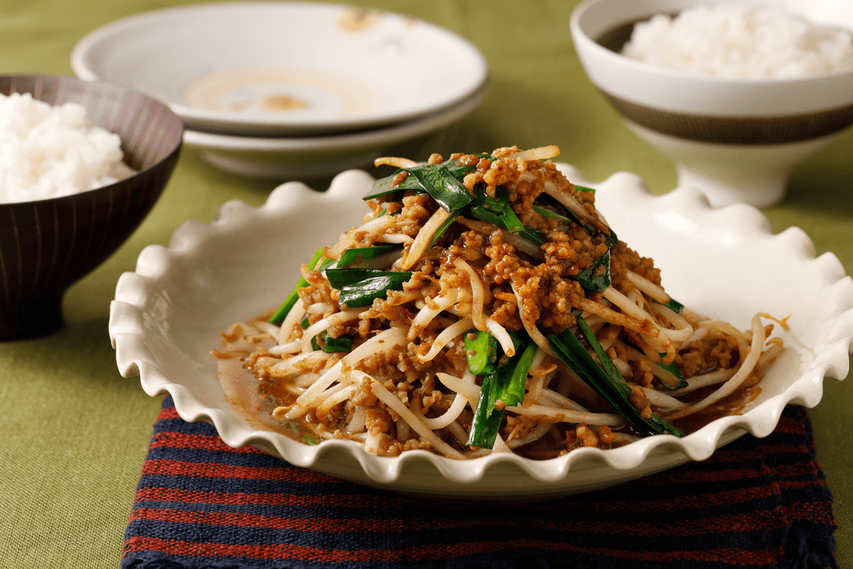 もやしとにらの照り焼きそぼろ炒め