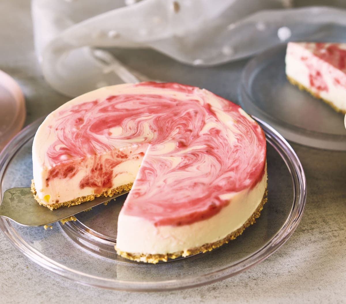 濃厚でまったりとしたレアチーズケーキに、いちごの酸味が相性抜群。 中までマーブル模様ができているので、カットしてもきれいですよ。