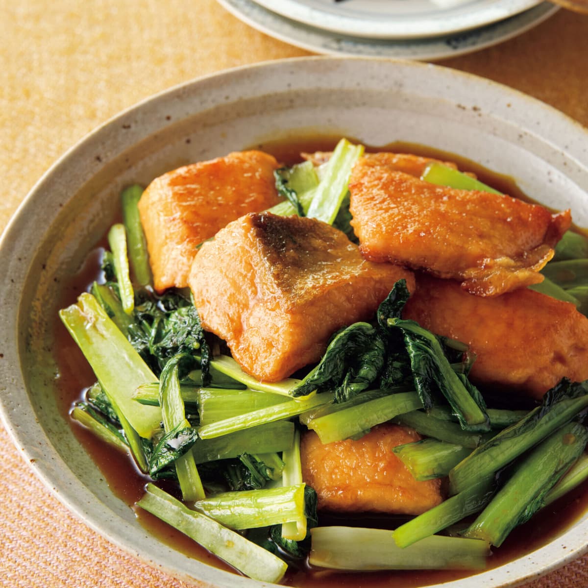 フライパンにサラダ油大さじ1/2を中火で熱し、鮭を並べ入れる。上下を返しながら3~4分焼き(身が厚い場合はふたをしてさらに1~2分蒸し焼きにする)、一度取り出す。サラダ油大さじ1/2をたし、強めの中火にして小松菜を入れて炒める。しんなりとしてきたらAを加えて混ぜる。鮭を戻し入れ、炒め合わせる。