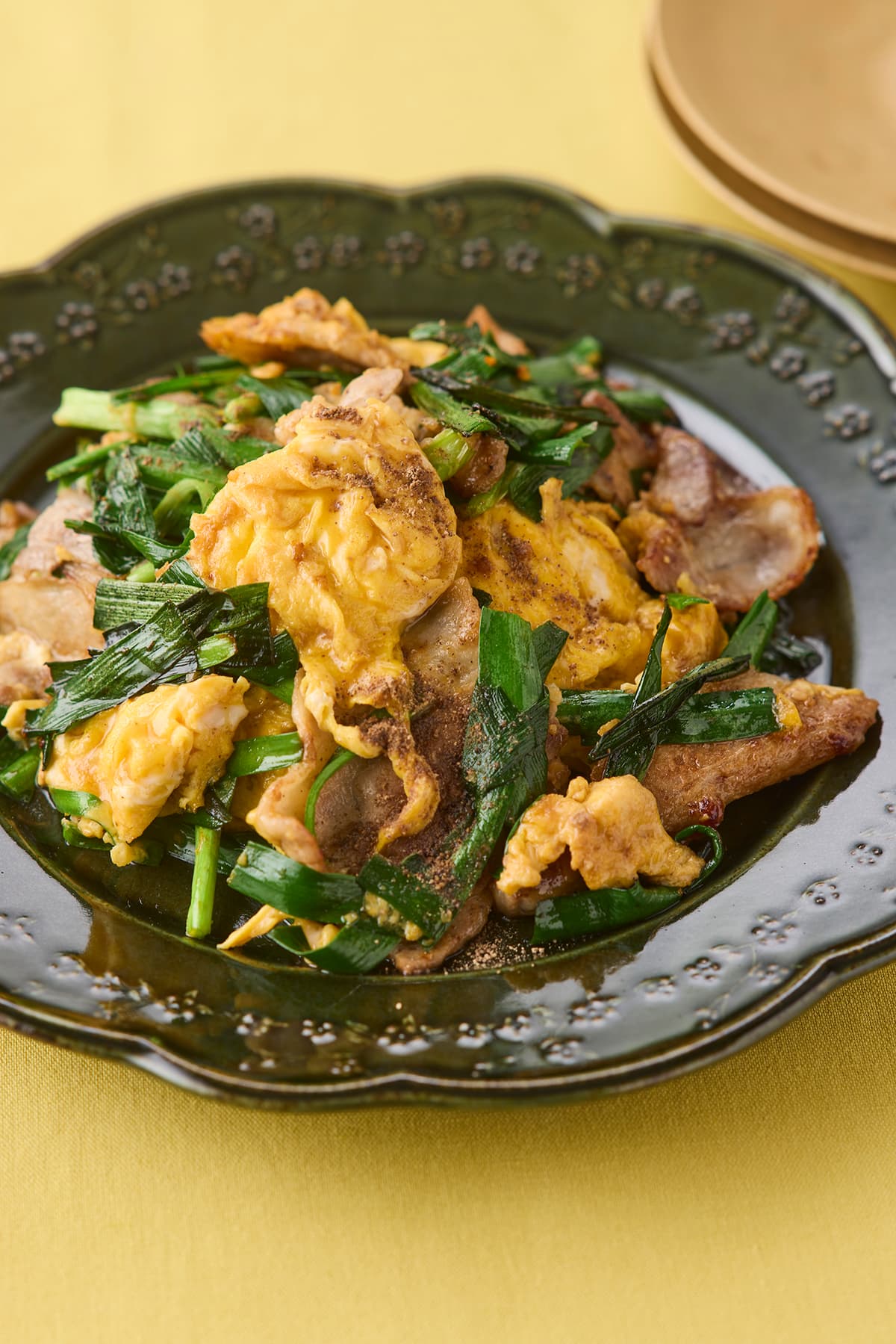 卵の味つけは塩ひとつまみとヒハツだけ。炒めたら、「もう少し加熱したほうがいいかな?」と迷う程度で取り出すのが、ふわとろの半熟状にするポイント。豚バラ、にら、しょうがを炒め、しょうゆとオイスターソースで味をつけたら、卵を戻し入れてさっとひと混ぜ。最後にヒハツをもうひとふりして、さわやかな風味に仕上げます。