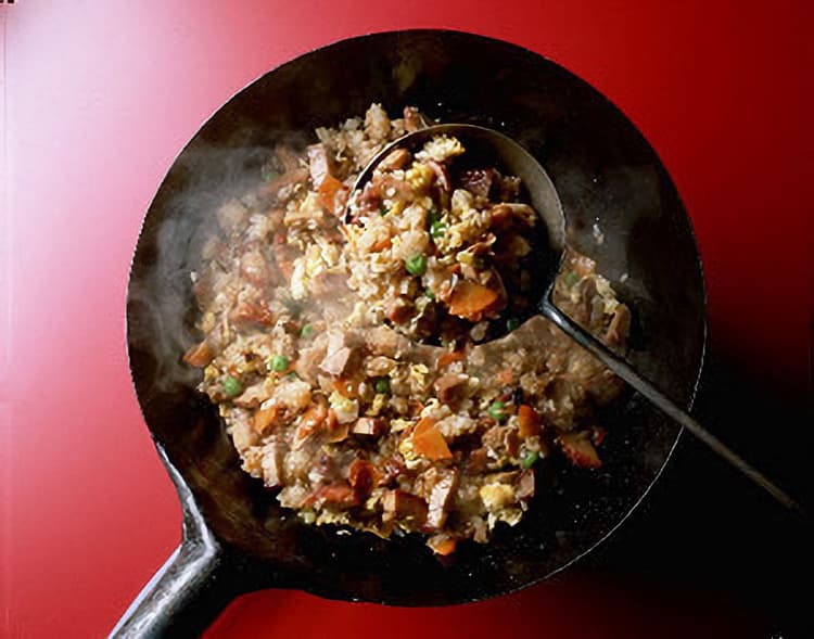サラダ油大さじ2を熱してしょうが、ねぎ、にんにくを炒め、香りが出たらにんじん、焼き豚、ご飯を加え、へらでご飯を切るように混ぜて焼きつけ、パラパラになったら塩、しょうゆ、コショウで調味して、卵を戻し、グリーンピースを加えてごま油で香りをつける。