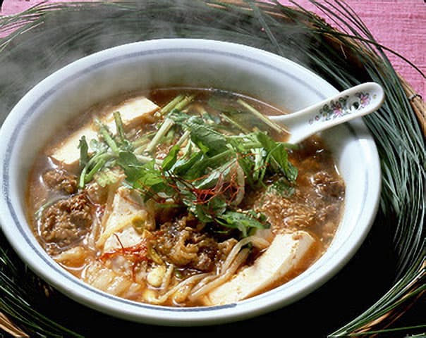 3.の汁にみそを溶かし、キムチ、豆もやし、豆腐を入れて煮立て、一味唐辛子をふる。砂糖で味をととのえて火を止め、せりとごま、細切りにした唐辛子を散らす。