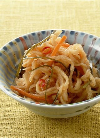 にんじんは皮をむいて、長さ4cmの細切りにする。昆布は、キッチンばさみで細切りにする。赤唐辛子は、へたと種を取って小口切りにする。ボールに水1/3カップと酢、みりん、しょうゆ、昆布、赤唐辛子を入れてさっと混ぜ合わせ、合わせ酢を作る。