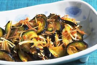 なす、みょうが、しょうがをボールに入れ、削りがつおと、しょうゆ小さじ1と1/2を加えて手で全体を混ぜ合わせ、器に盛る。