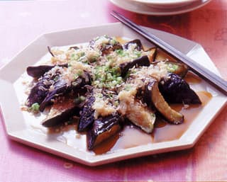 鍋に揚げ油を低温(160~165℃。乾いた菜箸の先を鍋底に当てると、細かい泡がゆっくりと揺れながら出る程度)に熱する。なすはへたとがくを取り除き、縦半分に切ってから、皮目に包丁で斜めに5mmほどの間隔で浅く切り目を入れる。さらに横に斜め半分に切り、切ったそばから揚げ油に入れる。きつね色になったら取り出し、熱いうちにたれのバットに入れて味をなじませる。なすを皿に盛ってバットに残ったたれを回しかけ、しょうが、削り節、万能ねぎをのせていただく。