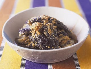 耐熱の皿になすを、水けを拭かずに並べ、ラップをして電子レンジで5分ほど加熱する。ラップをせずに冷蔵庫に入れて冷やす。ボールにすりごま大さじ2、砂糖小さじ1、しょうゆ大さじ1を入れて混ぜ、なすを加えてあえる。