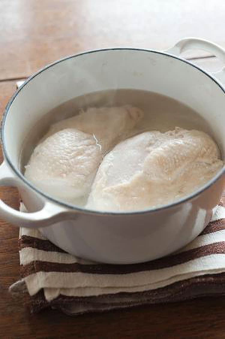 鍋に鶏肉、水2カップ、酒を入れ、ふたをして中火にかける。沸騰したらアクを取って弱火にし、3分ほどゆでる。裏返してふたをし、さらに3分ゆでて火を止め、余熱で火を通す。さめてから密閉容器にゆで汁ごと入れれば、冷蔵庫で3~4日ほど保存可能。