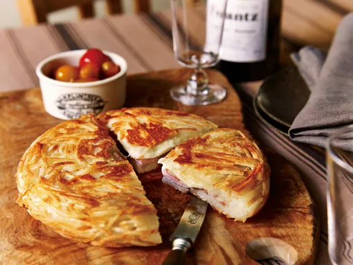 フライパンにごま油大さじ1を中火で熱し、ズッキーニとハムを全体に広げ入れる。生地の2/3量を全体に広げながら回し入れる。ズッキーニがこんがりと焼けてきたら、大きめの皿をかぶせてフライパンごとひっくり返して取り出す(やけどに注意)。すべらせながらフライパンに戻し入れる。