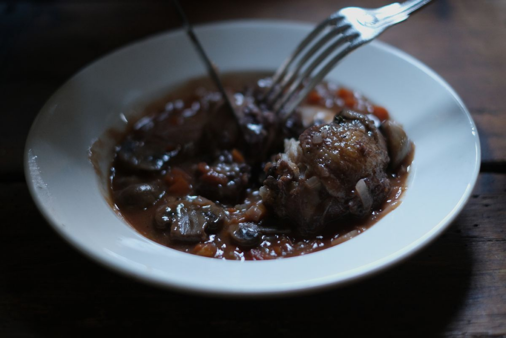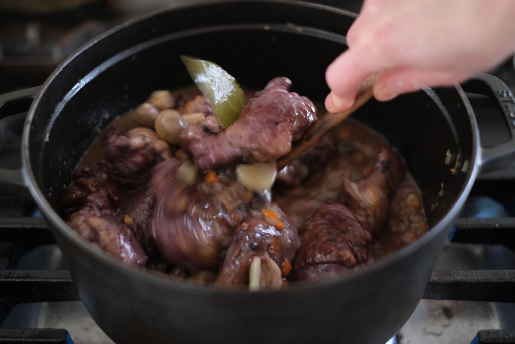 コック・オ・ヴァンとは鶏の赤ワイン煮込み。ブルゴーニュの郷土料理です。もともとは、肉質の堅い雄鶏をおいしく食べようと考えられたもので、特産品である赤ワインでじっくり煮込んでいたそう。とはいえ、私たちがふだん食べているのは若鶏。しっかりとした味わいに仕上げるために長時間煮込むと、むしろ煮くずれしやすくなるという問題があります。 そこで私は、いくつか〈待つ時間〉をつくっています。