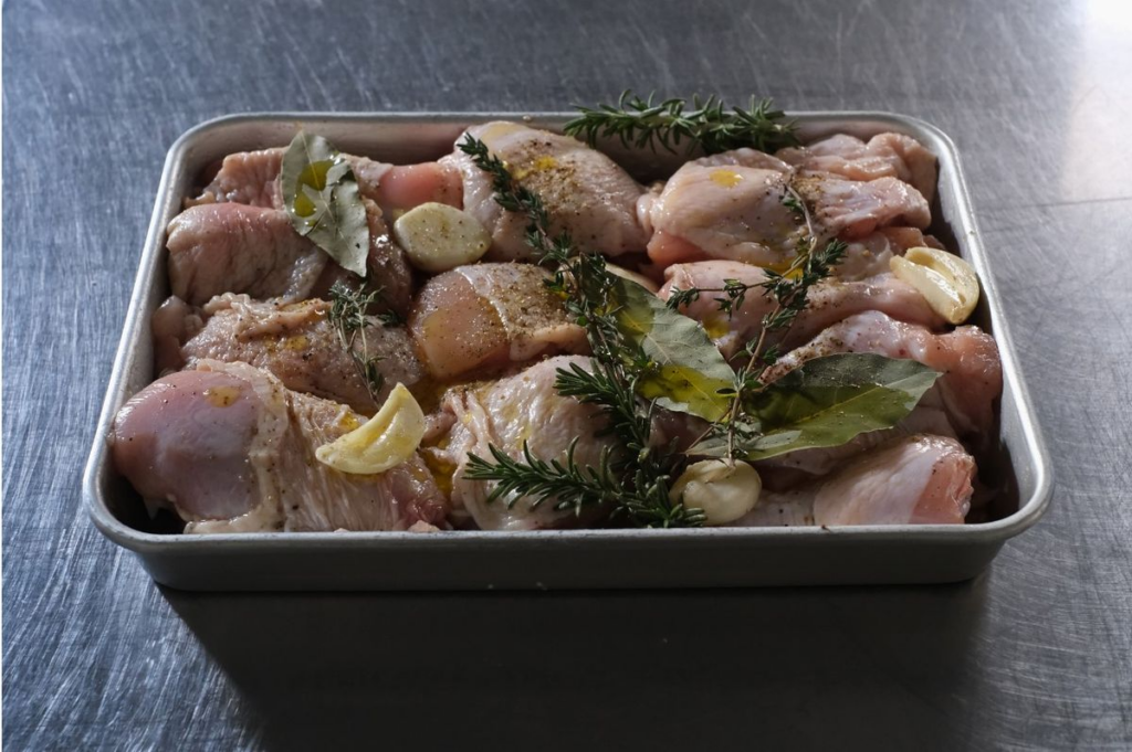 バットに(1)のもも肉と鶏手羽元を入れ、下味の材料をもみ込む。ラップをかけ、冷蔵庫で一晩置く。