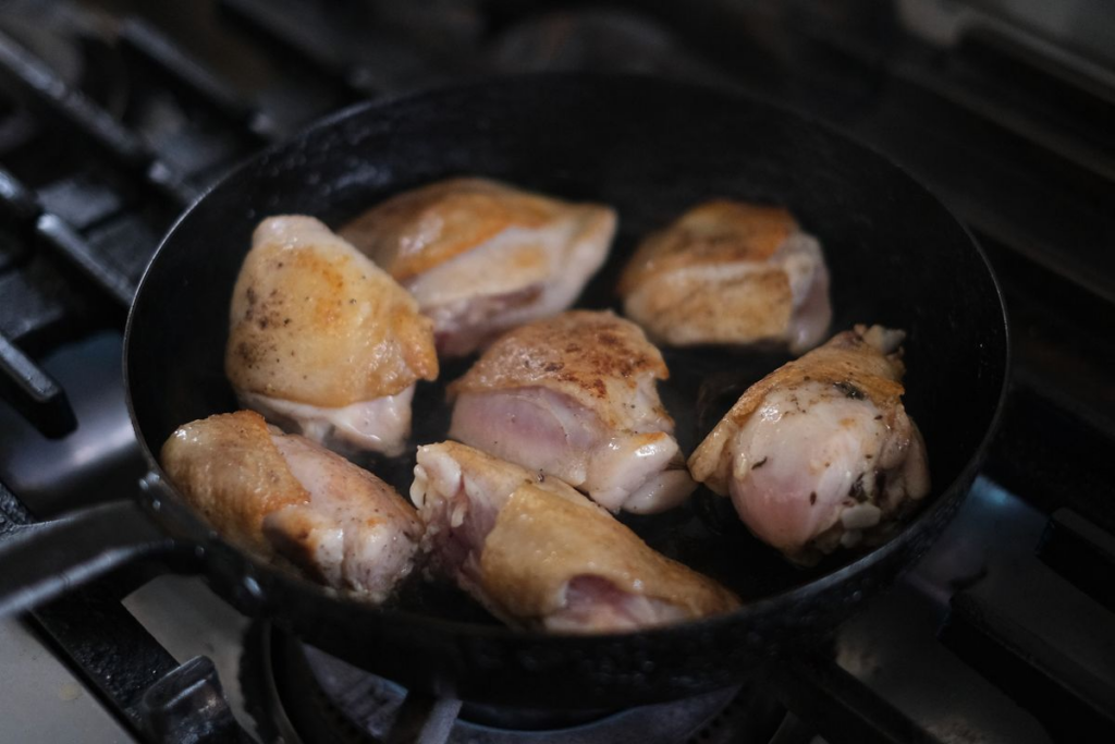 フライパンにオリーブオイル大さじ1を中火で熱し、鶏肉の1/2量を入れる。鶏肉の両面にしっかりと焼き色がつくまで焼き、バットなどに取り出す(中まで火が通ってなくてよい)。フライパンの余分な脂を拭き、残りの鶏肉も同様に焼いて取り出す。