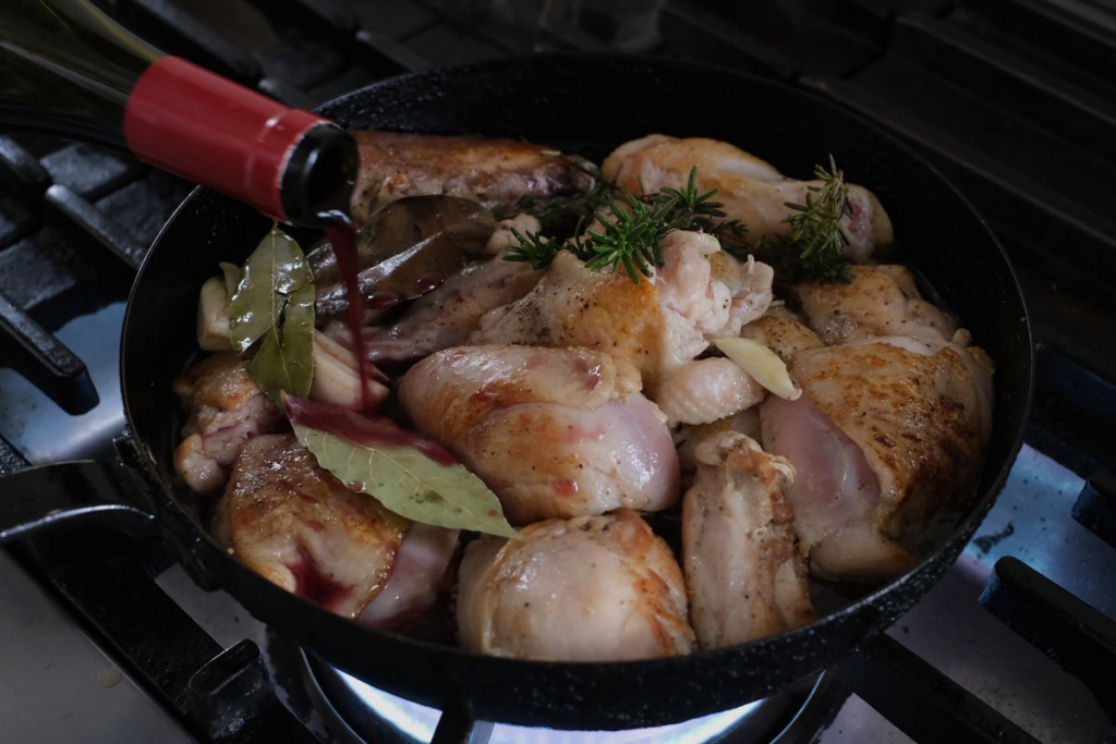 フライパンの余分な脂を拭いて(3)の鶏肉をすべて戻し入れ、下味のハーブ、赤ワイン500mlを加えて中火にかける。煮立ったら弱めの中火にし、10分ほど煮て火を止める。