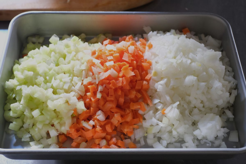 〈A〉のにんじんは皮をむき、残りの〈A〉とともに粗いみじん切りにする。マッシュルームは石づきを少し切り落とし、縦半分に切る。