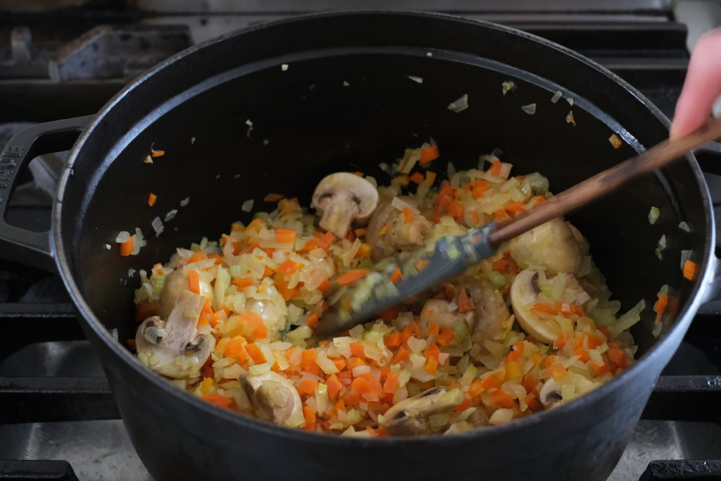 口径26cmの鍋にオリーブオイル大さじ3を中火で熱し、〈A〉を入れて、塩小さじ1/2をふって炒める。玉ねぎが透き通ってきたら、マッシュルームを加えてさっと炒める。水1/4カップを加えてふたをし、煮立ったら弱火にして5分ほど蒸し煮にする。ふたをはずし、強めの中火にしてときどき炒めながら水分をとばす。