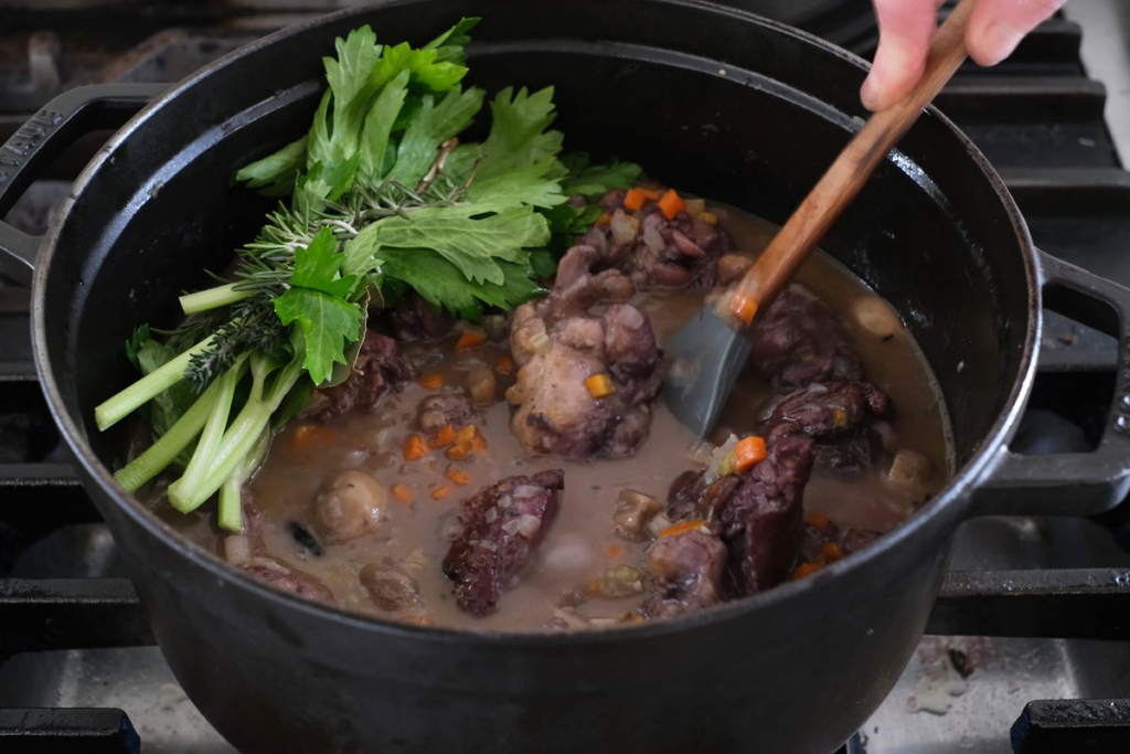 今回のもう一つの主役「ワイン」。ブルゴーニュ料理ゆえに、ブルゴーニュのものを使うのがいちばんですが、特にこだわらなくても大丈夫です。ただし、ワインの味が料理に影響するのは間違いないので、ここはご自身の好きな赤ワインで作るのはいかがでしょう。店ではアルコールが苦手なかたでもおいしくめしあがっていただけるように、味わいの深いものと軽めのものを混ぜて使って調整しています。