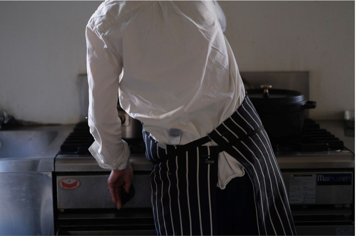 服が汚れないようにビブエプロンと呼ばれる胸当てのタイプのものをその日の服に合わせてフランス製の白か紺、イギリス製のストライプのものから選んで着用します。今回の撮影では肉料理にちなみイギリス製のブッチャーエプロン、もとは汚れが目立たぬように肉屋で働く人の為に作られたストライプ柄のものを選びました。